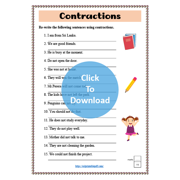 Contracted Form Posted byGayan21st Oct 2021Posted inGrammarTags:contracted form, contracted form worksheet, contracted form worksheet for grade 6, contracted worksheet for grade 7, contracted worksheet for grade 8, contractions Students have to re-write the sentences using contractions where necessary. Download Share this: Click to share on X (Opens in new window) X Click to share on Facebook (Opens in new window) Facebook Like Loading... Related