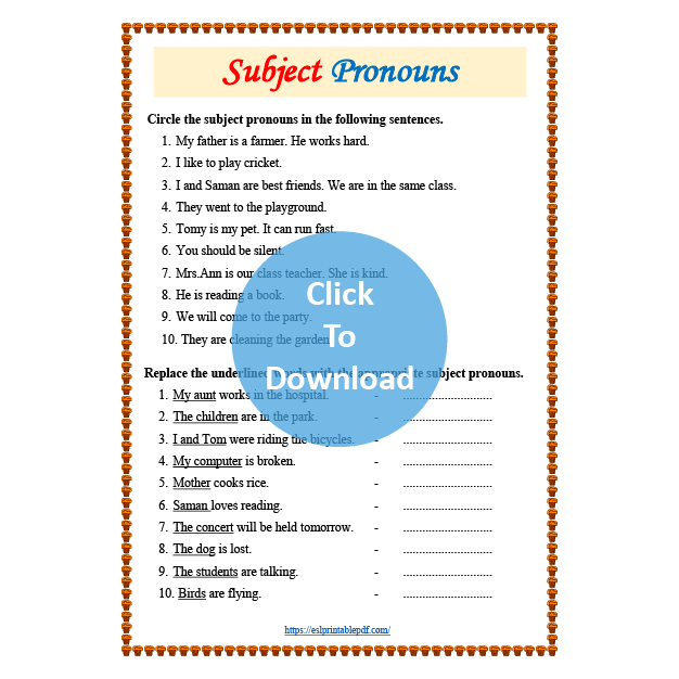 There are two exercises in this worksheet. The students have to circle the subject pronouns in the given sentences and write correct subject pronouns for the given nouns.
