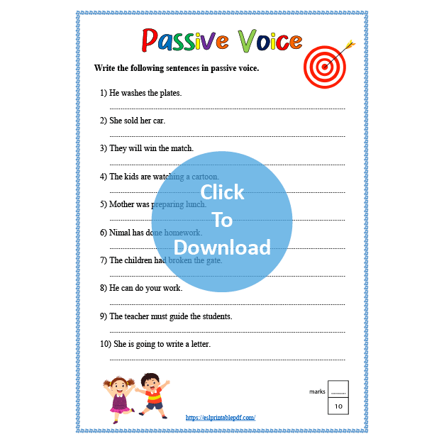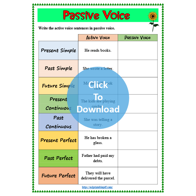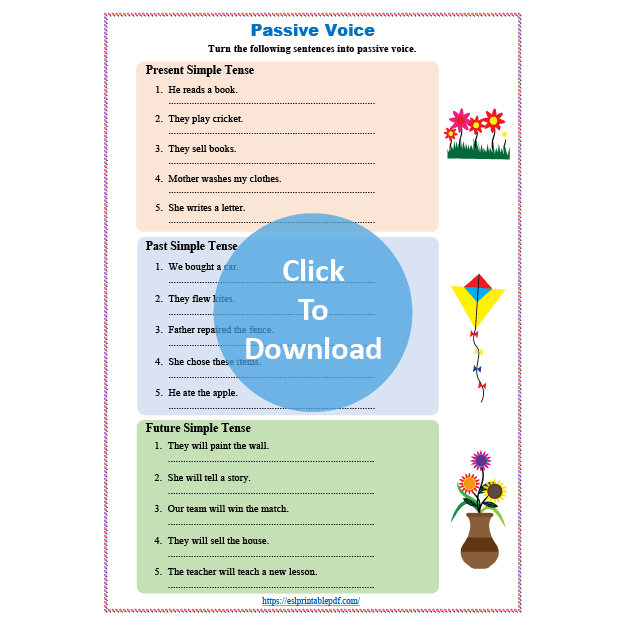 Students have to turn the sentences into passive voice. Only three tenses are included in the worksheet; simple present, simple past and simple future.