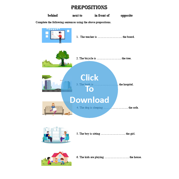This worksheet is about prepositions. Let the students complete the given sentences using “behind”, “next to”, “in front of” and “opposite”.