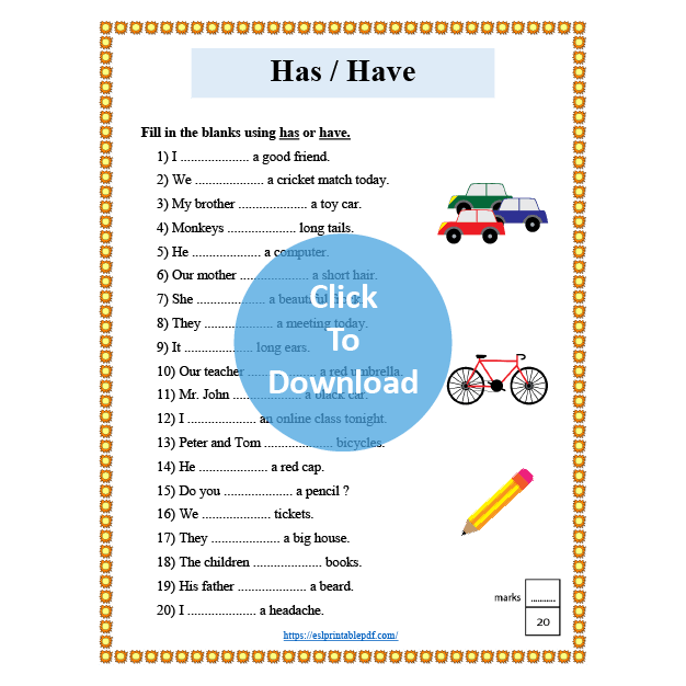 This worksheet is for elementary learners. This is a grammar worksheet. Students will learn the difference between has and have.
